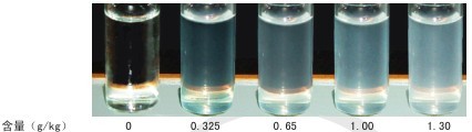 甜蜜素經(jīng)酸化后與顯色試劑反應(yīng),生成一種乳白色沉淀,穩(wěn)定性較好,而且混濁度與溶液中甜蜜素的含量成正比。