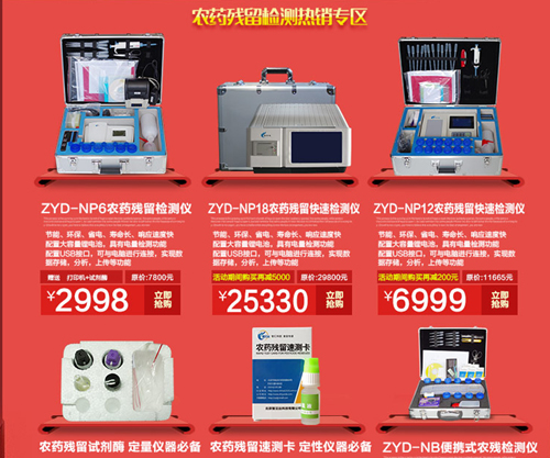 3.農藥殘留檢測產品降價大促銷,如原價7800元的ZYD-NP6農藥殘留檢測儀,現價2998元。ZYD-NP18農藥殘留快速檢測儀,原價29800元,現價25330元,活動期間購買再減5000元。還有適合各大品牌農殘儀使用的農藥殘留速測卡,原價30元,現價18元。