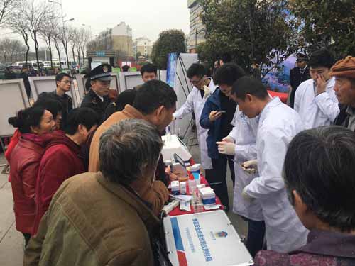 活動(dòng)現(xiàn)場(chǎng)發(fā)放宣傳材料的同時(shí),還有現(xiàn)場(chǎng)體驗(yàn)檢測(cè)服務(wù)。在CEC(安徽)食安體驗(yàn)中心的檢測(cè)咨詢臺(tái)前擠滿人群。消費(fèi)者將自己從各方購(gòu)買的果蔬等食品送到現(xiàn)場(chǎng)檢測(cè),幾個(gè)技術(shù)人員同時(shí)操作,部分消費(fèi)者在一旁等待檢測(cè),現(xiàn)場(chǎng)異常火爆。