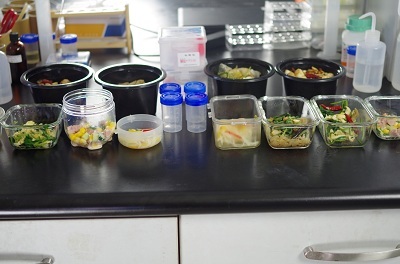 6組樣品分別是宮保雞丁,蠔油生菜,沙拉,菠菜炒雞蛋,蝦皮小白菜炒粉絲,土豆絲的隔夜菜以及所對(duì)應(yīng)的新炒菜。
