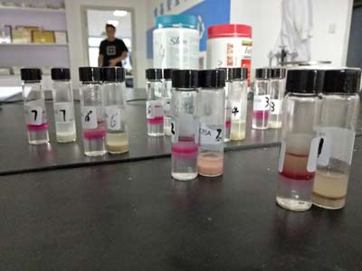 顯色劑的準備之后,取八份樣品,取一支試劑A,將所取樣品加入管中,蓋緊蓋子,充分震蕩混勻,靜置幾分鐘,使上層液澄清;然后用0.5mL吸管吸取試劑A瓶中上層溶液約一半的量至試劑B瓶中;蓋緊B蓋塞子,上下翻轉,使其混合,靜置至清晰分層;另取一支0.5mL 吸管,吸取試劑C至吸管細部前端約1/4 處,插入至試劑B瓶的下層溶液中并緩慢排空,觀察B瓶下層溶液中是否產生渾濁絮狀物或沉淀物。