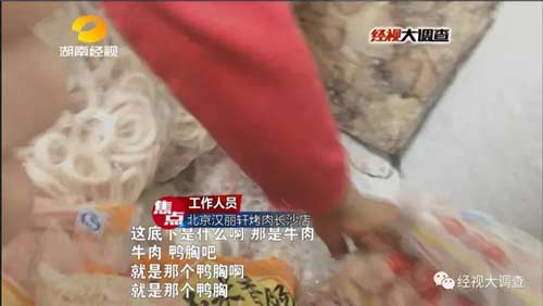 北京漢麗軒烤肉店遍布全國,可是在長沙這家店我們憤怒的看到,店里的所謂牛肉都是用鴨肉偽造,甚至還摻入變質的鴨肉,而且造假用的鴨肉都是統一配送過來的。若不是記者長時間辛苦的臥底調查,誰能知道其中真相!消費者會永遠被蒙蔽,欺詐伎倆會永遠繼續,漢麗軒會繼續“騙過全世界”。誠信不僅是經商的根本,更是做人的根本,對于這種弄虛作假的所謂全國連鎖,消費者不歡迎!我們期待執法部門重拳出擊,而不是為之遮丑掩蓋。