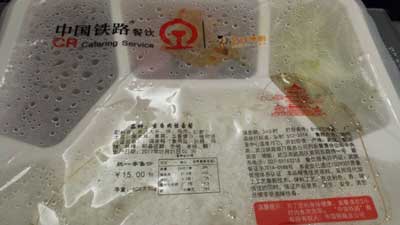 G523從北京西站發(fā)車時間是下午16:30,到武漢站的時間是晚上21:50,這個時間段正好是晚餐時間,18點不到,高鐵售貨員開始推著售貨車叫賣晚餐盒飯。記者所在的12車廂有幾位乘客詢問晚餐價格,售貨員推薦的都是40元的梅菜扣肉套餐,擺放在售貨車的外面,最后只有1位乘客購買了一份40元的梅菜扣肉套餐。記者多次向售貨員詢問是否有其他盒飯,便宜一點的套餐,售貨員才從餐車內(nèi)取出15元的套餐,記者點了一份15元的魚香肉絲套餐,套餐內(nèi)有魚香肉絲、干蘿卜炒肉和包菜共3個菜,感覺挺實惠。很多乘客在晚餐的飯點都是自備的面包、點心和方便面之類的食品。
