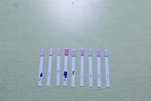9種樣品取樣檢測后,檢測試紙顏色基本未變,也未呈現(xiàn)藍紫色。