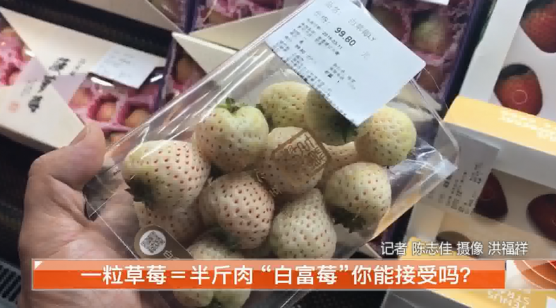 在蘇州園區的這家超市里,水果專柜上擺放著這樣的白色草莓,通體發白,帶著淡淡的粉,看上去有點不尋常,價格更是賣到了7塊錢一粒。而一旁,還有更貴的,這盒草莓個頭稍大,11顆價格近100元,每顆草莓算下來要9塊錢。而這些正是最近紅遍朋友圈的白色草莓,人稱“白富莓”。