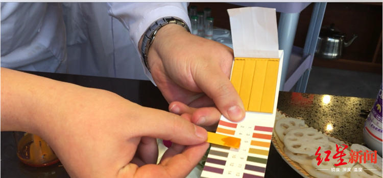 只見實(shí)驗(yàn)人員從鍋中舀了一勺油,倒入實(shí)驗(yàn)杯,用試管將油滴在pH試紙上,很快,試紙就呈現(xiàn)出黃褐色,跟手中的PH試紙一對(duì)比,pH值為5。