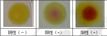 若點樣位置顯紫色、紫紅色、紅色、紅褐色,則可判定樣品中含有雙胍類物質(zhì)即為陽性(+);若顯淡黃色、黃色則為陰性(-)。