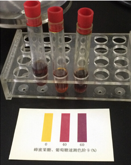 4.把樣品顯色管與果糖和葡萄糖比色卡比對(duì),即可讀出樣品中果糖和葡萄糖的含量。1、3管為樣品,均大于60%,符合國(guó)家標(biāo)準(zhǔn)。