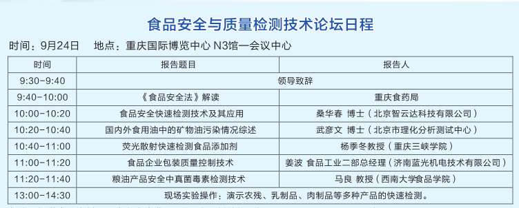 快檢培訓班已在北京舉辦九期,第十期與往常不同,在重慶。您一定很好奇,為什么這次培訓班安排在重慶,如果您關注我們的網站及微博、微信,您會發(fā)現,智云達受邀參加由中國儀器儀表學會牽頭的四家機械行業(yè)專業(yè)組織2015年9月22日-25聯合在重慶國際展覽中心共同舉辦“中國(重慶)智能制造技術裝備博覽會”(簡稱智博會)。為了讓客戶和學員有參與高質量技術論壇,學習更多除快檢常識外知識的機會,本次培訓班特改為參加食品安全與質量檢測技術論壇。