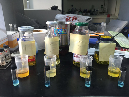 結果判斷:如溶液顯淺黃色,說明油樣酸價≥8mgKOH/g,酸價指標為陽性;溶液顯藍色、淺藍色或綠色,酸價指標為陰性。溶液出現(xiàn)混濁,水分指標為陽性;溶液澄清透明,水分指標為陰性。
