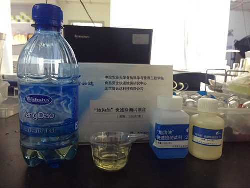 此樣品溶液較為渾濁,因此判定水分指標為陽性。三項指標中有一項不符,判定此油樣為地溝油。