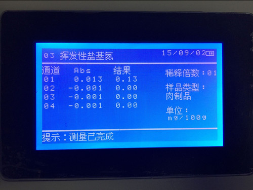 放入儀器中,檢測(cè)。檢測(cè)結(jié)果顯示揮發(fā)性鹽基氮含量。鮮(凍)畜肉≤15mg/100g,樣品中揮發(fā)性鹽基氮含量合格,符合國(guó)家標(biāo)準(zhǔn)。