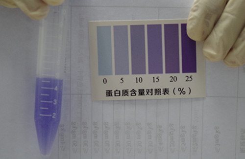 取4 mL顯色液加入比色管中,蓋上蓋,用力將奶粉全部搖溶,顯色3分鐘,在3~5分鐘內將比色管襯在白紙上與標準比色卡進行對比,找出與乳粉蛋白質標準比色卡上相近的色階,即為每100g乳粉樣品中蛋白質的含量。