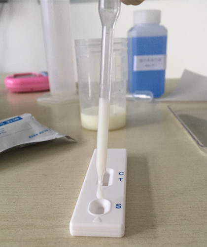 用干燥、潔凈的比色管盛放奶粉,用純凈水1:10稀釋(1份奶粉+10份純凈水),溶解后用于檢測。