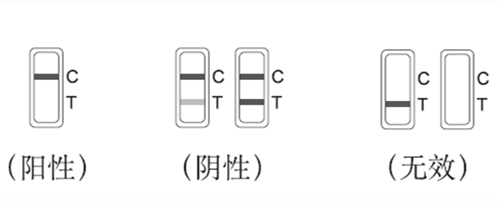 無(wú)效:位置C不顯示出條帶,則無(wú)論位置T顯示出條帶與否,該速測(cè)卡均判為無(wú)效,請(qǐng)重測(cè)。