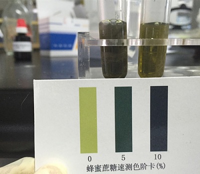 把離心管放入沸水浴中加熱5分鐘,取出與比色卡比對(duì),讀出樣品中蔗糖的含量(%)。根據(jù)國(guó)家標(biāo)準(zhǔn)規(guī)定,桉樹(shù)蜂蜜、柑橘蜂蜜、紫苜蓿蜂蜜、荔枝蜂蜜、野桂花蜜中蔗糖應(yīng)≤10 g/100 g,其他蜂蜜應(yīng)≤5 g/100 g。結(jié)果顯示樣品中蔗糖含量符合國(guó)家標(biāo)準(zhǔn)。