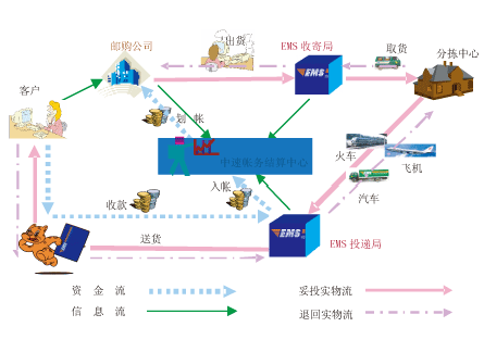 在代收貨款系統(tǒng)業(yè)務流程中,共有5個節(jié)點,分別是:客戶、郵購公司、EMS收寄局、EMS投遞局和中速帳務結算中心,各節(jié)點之間的關系如下圖所示: